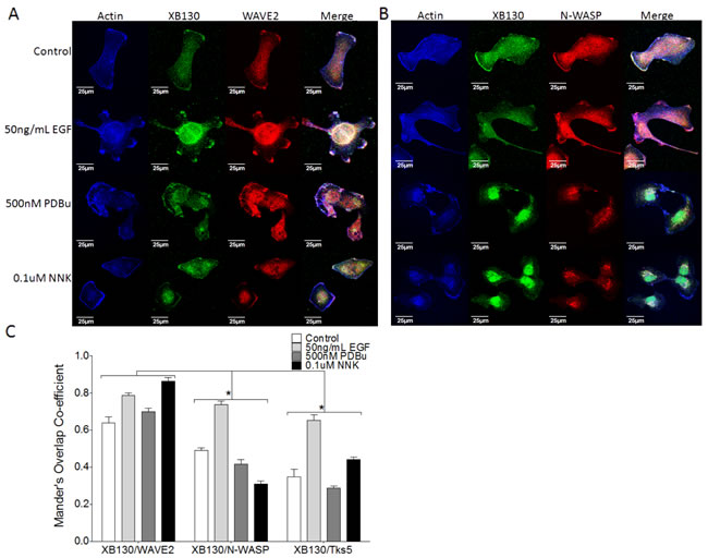 Lamellipodia and podosomes are two major cytoskeletal structures that regulate cell migration and invasion, respectively. Many of the same proteins have been found in both structures and a limited subset of proteins is regarded as specific components for either lamellipodia or podosomes. The WASP family is highly integrated into cell migration signaling by binding and activating actin related protein complex (ARP2/3) for nucleation of actin filaments for the formation of actin-rich cytoskeleton structures, like lamellipodia, filopodia and podosomes [31]. Several studies have demonstrated the role of WAVE2 as a marker of lamellipodia that primarily localizes at the leading edge of migrating cells [32]. Similar to observations seen in WAVE2 knockout cells [33], we observed that down regulation of XB130 expression with siRNA effectively inhibits cell migration and the formation of lamellipodia at the leading edge of cells. Immunofluorescence staining shows that both XB130 and WAVE2 translocate to the cell periphery and co-localize robustly at bands along the lamella of cells after stimulation. Stimulation with EGF, PDBu or NNK promotes both XB130 and WAVE2 redistribution from the cytoplasm to cell membrane. As WAVE2 is a marker of lamellipodia, N-WASP is critical for podosome/invadopodia formation [34]. N-WASP has been previously identified as a Tks5 binding partner that regulates actin assembly during podosome assembly [6]. As expected, we observed that both N-WASP and Tks5 localized to podosomes after PDBu or NNK stimulation. In contrast, XB130 did not colocalize with Tks5 or N-WASP at podosomes but rather at the cell periphery. These observations confirm that XB130 is a marker for lamellipodia in cells.