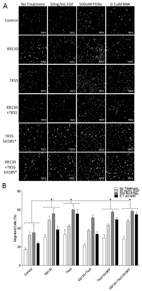Figure 5: Co-expression of XB130 and Tks5 inhibit the enhanced cell migration observed in cells overexpressing XB130 or Tks5 alone. Double chamber transwell cell migration assay using cells transfected with GFP/mCherry-vectors (Control), GFP-XB130/mCherry, GFP/mCherry-Tks5, GFP-XB130/mCherry-Tks5, GFP/mCherry/Myc-Tks5 SH3#5* or GFP-XB130/mCherry/Myc-Tks5 SH3#5*. Cells were stimulated with 50 ng/mL EGF, 500 nM PDBu or 0.1 μM NNK for 1 h. FBS was added to the lower chamber as a chemoattractant. A. Images of cells that migrated past the transwell membrane. Scale bars represent 500 μm. B. Percentage of migrated cells past the transwell membrane. Over-expression of XB130 or Tks5 alone or Tks5 SH3#5* with or without XB130 significantly increases cell migration, whereas, co-expression of both XB130 and Tks5 has only a moderate increase in cell migration as compared to control cells, after stimulation. Data is summarized from three independent experiments and presented as mean ± SD. * represents p < 0.01 of XB130 or Tks5 over-expressing groups versus the control vector-transfected group.