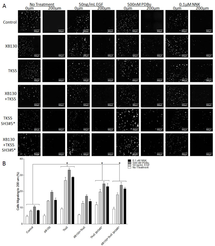 Figure 6: Co-expression of XB130 with Tks5 inhibits the enhanced ECM-dependent cell migration observed in cells over-expressing Tks5 only. Matrigel-coated double chamber transwell cell migration assay using cells transfected with GFP/mCherry-vectors (Control), GFP-XB130/mCherry, GFP/mCherry-Tks5, and GFP-XB130/mCherry-Tks5. Cells were stimulated with 50 ng/mL EGF, 500 nM PDBu or 0.1 μM NNK for 1 h. FBS was added to the lower chamber as a chemoattractant. A. Images of cells cultured on a thin matrigel coating at 0 μm and migration to 200 μm. Scale bars represent 500 μm. B. Percentage of cells migrating to a depth of 200 μm of matrigel. Over-expression of Tks5 alone or Tks5 SH3#5* with or without XB130 significantly increases cell migration into matrigel, whereas, over-expression of XB130 alone does not significantly increase ECM-dependent cell migration, after stimulation, as compared to control cells. Cells co-expressing XB130 with Tks5 show a similar percentage of migrating cells as XB130 over-expression alone. The over-expression of XB130 appears to inhibit Tks5-mediated cell migration, indicating a regulatory effect of XB130 on Tks5. Data is summarized from three independent experiments and presented as mean ± SD. * represents p < 0.01 of the Tks5 over-expressing groups versus vector-transfected control group.