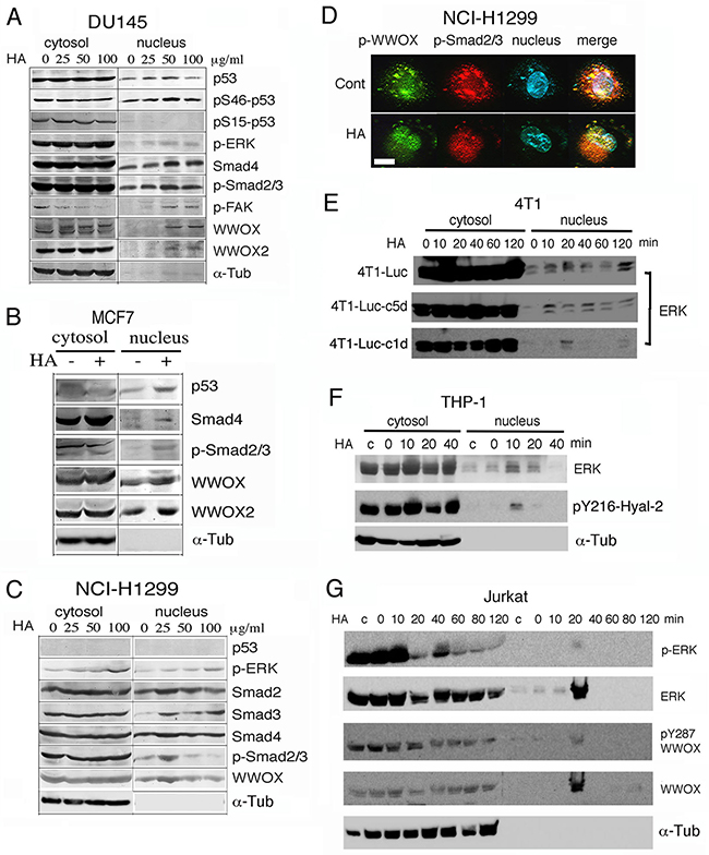 Figure 1: Hyaluronan induces nuclear accumulation of WWOX, Smads and others proteins. A. Prostate DU145 cells were treated with high-molecular-weight hyaluronan (HA; 105–106 kDa; 50 μg/ml; Sigma) for 1 hr. Nuclear translocation of full length WWOX, isoform WWOX2, p-FAK, p-Smad2/3, Smad4, p-ERK, and pSer46-p53 is shown (~100–300% increases). Time course analysis showed that in response to a low level of HA at 100 ng/ml, WWOX and Smad4 relocated to the nucleus in 40 min (Supplementary Figure S1). B. Breast MCF7 cells were treated with HA for 1 hr. Nuclear translocation of WWOX, WWOX2, p53, p-ERK and p-Smad2/3 was shown. C, D. p53-deficient NCI-H1299 cells were treated with medical grade HA for 1 hr. Nuclear translocation of WWOX, p-WWOX (Tyr33 phosphorylation) and Smads is shown by Western blotting and fluorescence microscopy (~100–300% increases in nuclear localization using 25 μg/ml HA). 25 μg/ml HA was used in (D). Note the colocalization of p-WWOX with p-Smad2/3 in the cytosol and their nuclear accumulation post HA treatment. Scale bar, 10 μm. E-G. Mouse breast cancer 4T1 cells (wild type and 2 cold-resistant variants), human monocytic THP-1 cells, and human leukemia Jurkat T cells were treated with HA (25 μg/ml) for indicated times. Nuclear accumulation of indicated proteins occurred in 10-20 min. c = medium control; α-Tub=α-Tubulin.
