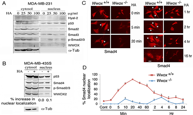 WWOX-negative cells are refractory to HA-induced nuclear relocation of Smad4 and other proteins