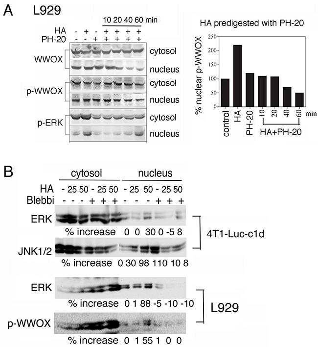 Figure 3: Blebbistatin blocks HA-mediated protein nuclear translocation. A. HA (100 μg/ml) was predigested with PH-20 (100 units/ml) for various indicated times. The digested HA could not induce nuclear translocation of WWOX, p-WWOX and p-ERK in L929 cells (representative data from 2 experiments). The extent of p-WWOX nuclear translocation is quantified (right panel). B. L929 and 4T1-Luc-c1d cells were pre-treated with blebbistatin (10 μM) for 1 hr, followed by exposure to HA (25 and 50 μg/ml) for determining the relocation of indicated proteins to the nucleus by Western blotting. Blebbistatin blocked HA-induced nuclear relocation of ERK, JNK and pY33-WWOX. p-WWOX = pY33-WWOX; Blebbi = blebbistatin.