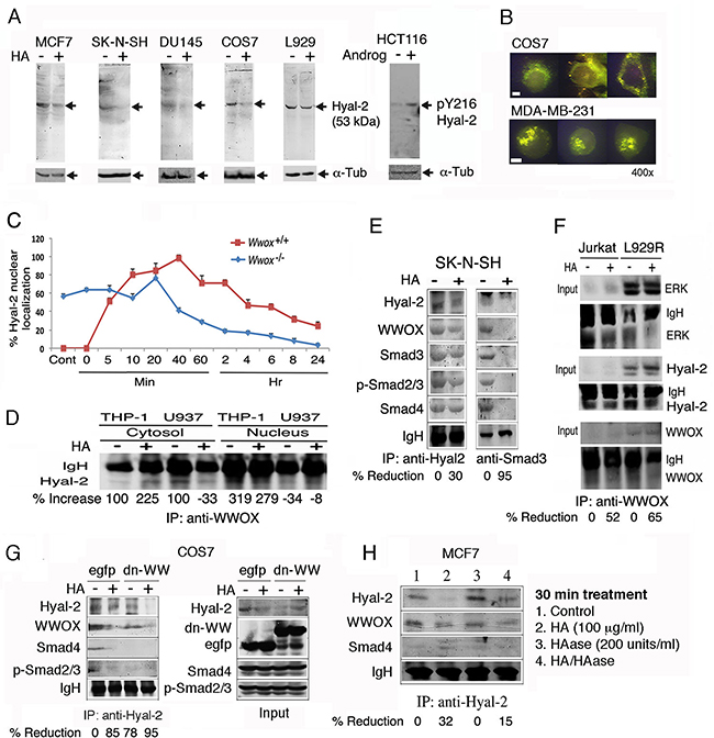 Figure 4: HA increases the complex formation of Hyal-2, WWOX and Smads, followed by reduction. A. Indicated cell lines were treated with HA (50 μg/ml) for 30 min at 37°C. Cytosolic fractions were used for reducing SDS-PAGE and Western blotting. HCT116 cells were treated with androgen (100 ng/ml) for 30 min, which led to increased pY216-Hyal-2 expression. B. Immunostaining of non-permeabilized COS7 cells shows the expression of Hyal-2 on cell surface. Hyal-2 is clustered on the surface of non-permeabilized MDA-MB-231 cells. Scale bar, 5 μm. C. HA (25 μg/ml) rapidly induced translocation of Hyal-2 to the nucleus in the wild type Wwox+/+ MEF cells, followed by reduction. In the knockout Wwox-/- MEF cells, approximately 60% of endogenous Hyal-2 is present in the nucleus. HA reduces the nuclear localization. D. By immunoprecipitation using WWOX antibody, HA increased the WWOX/Hyal-2 complex in the cytosol, whereas the nuclear level of the complex was still low in THP-1 cells. In U937 cells, HA reduced the cytosolic WWOX/Hyal-2 complex in 30 min and showed the increased complex in the nucleus. E. HA (25 μg/ml) reduced the cytosolic Hyal-2/WWOX/Smads complex in SK-N-SH cells in 30 min, as determined by immunoprecipitation using Hyal-2 antibody. Immunoprecipitation by Smad3 antibody revealed the presence of the Hyal-2/WWOX/Smads complex in resting cells and HA decreased the complex. F. Jurkat T cells and L929R fibroblasts were treated with HA (25 μg/ml) for 30 min, followed by processing immunoprecipitation with WWOX antibody. HA reduced the complex formation of cytosolic WWOX/Hyal-2/ERK. G. HA reduced the complex formation of Hyal-2/WWOX/Smad4 in EGFP-expressing COS7 cells. Also, ectopic EGFP-dn-WW suppressed the complex formation. In the input, one-tenth amounts of the cell lysates were loaded in the SDS-PAGE. H. The Hyal-2/WWOX/Smad4 complex was not affected by hyaluronidase PH-20 treatment of MCF7 cells for 1 hr.