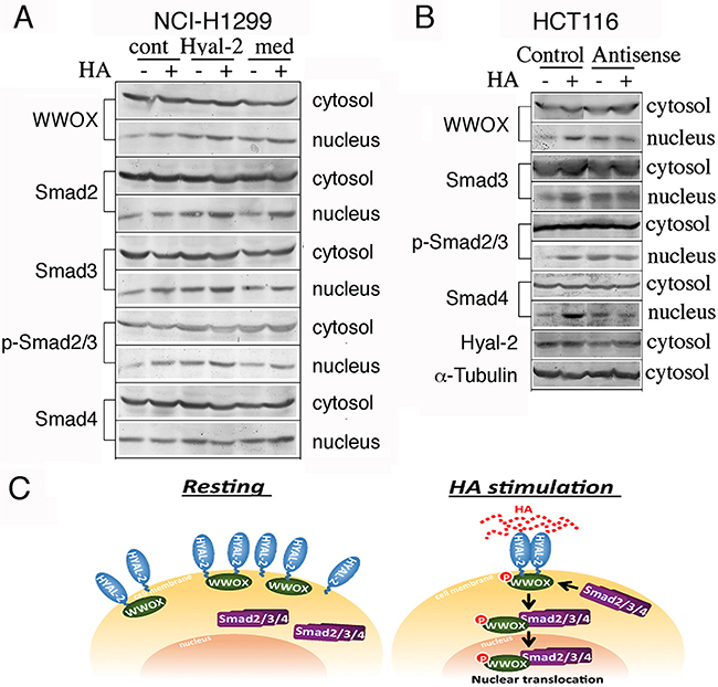 Figure 6: Induction of WWOX and Smads nuclear accumulation by agonist Hyal-2 antibodies and antisense mRNA. A. Compared to non-immune serum (cont) and medium control (med), exposure of NCI-H1299 cells to agonist antibodies against Hyal-2 (1:1000 dilution) for 30 min resulted in spontaneous nuclear translocation of WWOX and Smads (~75-200% increase in nuclear localization; see the nuclear protein levels without HA treatment; representative data from 2 experiments). These cells were further exposed to HA (100 μg/ml) for 30 min. B. Similarly, suppression of Hyal-2 expression by antisense mRNA (~70% reduction) spontaneously induced nuclear translocation of WWOX and Smads in TβRII-deficient colon HCT116 cells. Without Hyal-2, HA could not increase nuclear translocation of these proteins (~100-200% increase in nuclear localization; see the nuclear protein levels without HA treatment; representative data from 2 experiments). C. In resting cells, Hyal-2 binds WWOX in the cell membrane or in the lysosome. HA increases the formation of the Hyal-2/WWOX/Smads complex for relocating to the nucleus. Without WWOX, Hyal-2 may spontaneously accumulate in the nucleus.