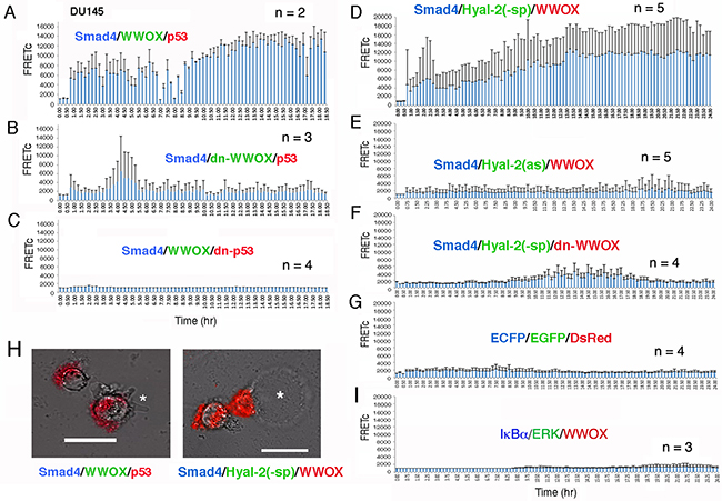 Figure 7: Time-lapse FRET microscopy for HA-activated signaling pathways. A. DU145 cells were transiently transfected with ECFP-Smd4, EGFP-WWOX and DsRed-monomer-p53 expression constructs. HA (25 μg/m) induced energy transfer from ECFP-Smad4 to EGFP-WWOX and then to DsRed-monomer-p53 for the Smad4/WWOX/p53 signaling. Data are shown as FRETc (FRET concentration). B, C. Dominant negatives for WWOX and p53 abolished the signaling. D. HA also induced signaling for ECFP-Smd4, EGFP-Hyal-2(-sp) and DsRed-monomer-WWOX. Cytosolic EGFP-Hyal-2(-sp) is devoid of the GPI linkage. E, F. Both antisense mRNA targeting Hyal-2 and dn-WWOX abolished the HA-induced signaling. G. In negative controls, HA did not induce signaling in cells expressing ECFP, EGFP and DsRed. H. The Smad4/WWOX/p53-expressing cells started to undergo membrane blebbing post stimulation with HA for 1.5 hr (see the star in the left). No cell death occurred. In contrast, Smad4/Hyal-2/WWOX-expressing cells underwent bubbling cell death [51, 52], post HA stimulation for 5-16 hr (see the star for the generated bubble in the right). Also, see Supplementary Video legends and Videos S1-S9. I. Similarly, HA failed to induce the activation of the IκBα/ERK/WWOX signaling [42].
