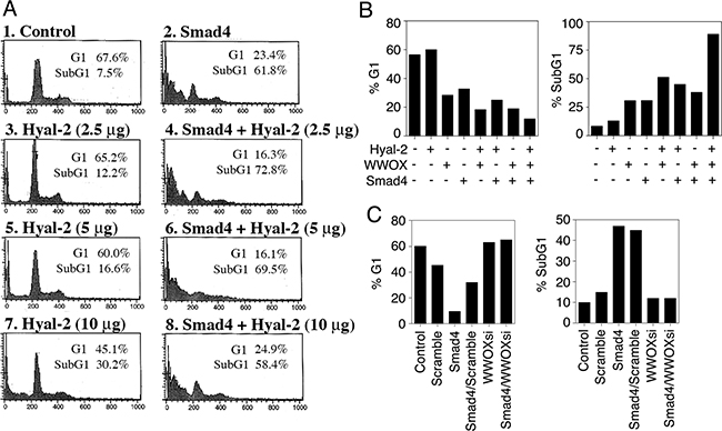 Figure 9: Hyal-2, WWOX and Smad4 synergistically induce apoptosis. A. L929 cells were electroporated with Hyal-2 and/or Smad4 constructs, cultured 48 hr, and subjected to cell cycle analysis by FACS. Hyal-2 could not bind Smad4 (see Figure 5), and did not enhance the apoptotic function of Smad4 (% apoptosis = % subG1 phase of the cell cycle). B. Under similar conditions, L929 cells were transfected with Hyal-2, WWOX, and/or Smad4. Hyal-2 enhanced WWOX-mediated apoptosis. In combination, these 3 proteins increased cell death. C. In contrast, WWOXsi blocked Smad4-mediated apoptosis. In controls, scramble siRNA had no effect. WWOXsi, siRNA-targeting WWOX. All data are average from two experiments B, C. Unless otherwise indicated, 5 μg DNA constructs were used in electroporation. Data for both G1 and SubG1 phases are shown for all experiments.