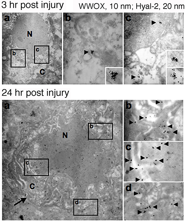 Figure 10: Nuclear accumulation of Hyal-2 and WWOX in apoptotic nuclei of cortical neurons during traumatic brain injury. Rats were stabbed with needles into their brains to induce traumatic brain injury. Post injury for 3 and 24 hr, rats were sacrificed. There were increased numbers of apoptotic neurons in the brain cortex, with the presence of the Hyal-2/WWOX complex in the apoptotic nuclei of neurons.