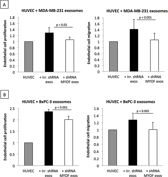 Cancer-derived exosomes are known angiogenic mediators in the complex crosstalk between cancer and endothelial cells [3]. We made use of this known biological mechanism to examine the functional impact of myoferlin-depletion in MDA-MB-231- and BxPC-3-derived exosomes. As outlined in Figure 5A-5B, endothelial cells incubated with control cancer cell-derived exosomes displayed increased rates of proliferation and migration. However, when the HUVEC were incubated with myoferlin-depleted exosomes, these effects were significantly decreased, restoring the proliferation and migration responses similar to those of non-treated cells (Figure 5A-5B).