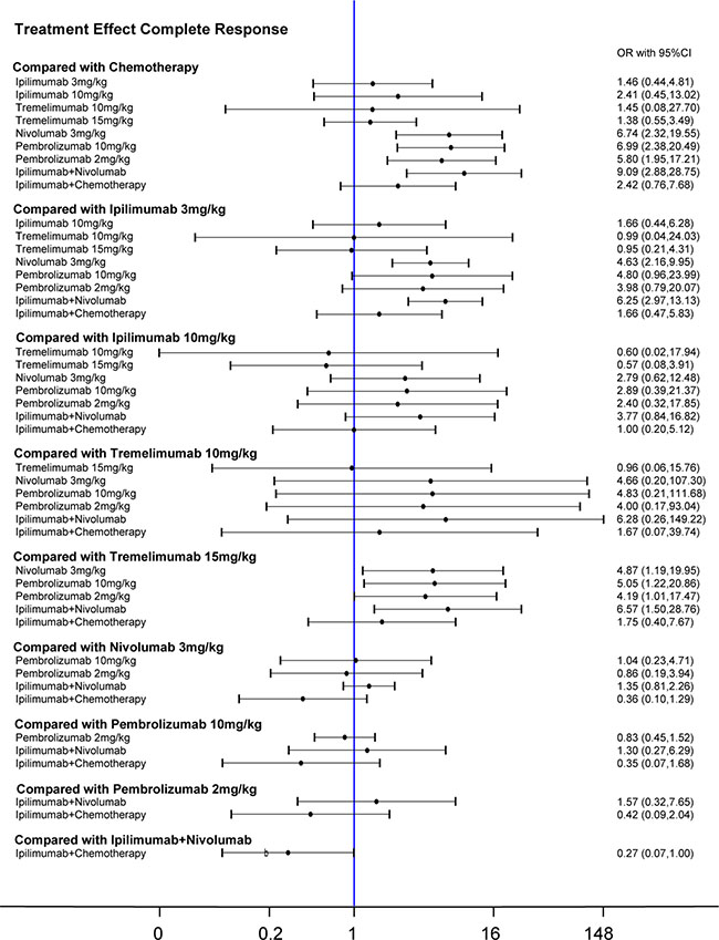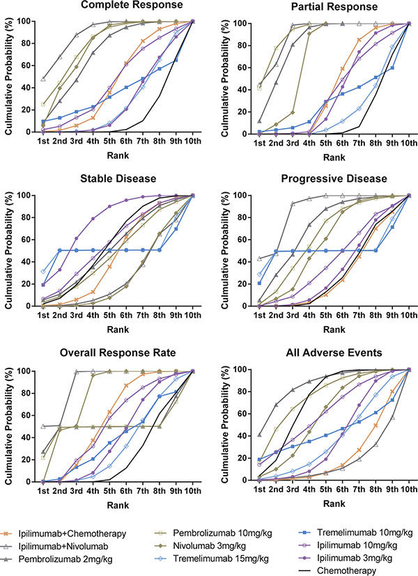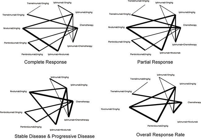 There are also some limitations of our meta-analysis that should be noted. Although this is a large-scale meta-analysis concerning the therapeutic value of immunotherapy and chemotherapy on melanoma, the samples size is quite limited. Subgroup analysis based on the ethnicity and age of patients was not performed. The lack of standardized agents in chemotherapy may also affect the reliability and validity of our results. Meanwhile, there are no sufficient data on SD and PD, which leads to several low reliable results. For example ipilimumab + nivolumab ranked low in SD but highest in PD among all. Further test of SD and PD should be determined to optimize the result. Furthermore, our study only compared the therapeutic value of CTLA4 and PD-1 inhibitors. The MEK inhibitor trametinib and BRAF inhibitors, such as vemurafenib and dabrafenib were not enrolled in the comparison as we failed to retrieve related RCTs.