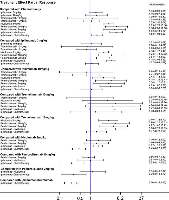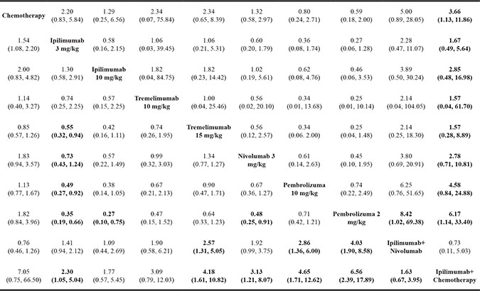 In the current study, we investigated the therapeutic value of immunotherapy and chemotherapy on melanoma. Interventions were categorized as chemotherapy, ipilimumab 3 mg/kg, ipilimumab 10 mg/kg, tremelimumab 10 mg/kg, tremelimumab 15 mg/kg, nivolumab 3 mg/kg, pembrolizumab 10 mg/kg, pembrolizumab 2 mg/kg, ipilimumab + nivolumab and ipilimumab + chemotherapy. The outcomes assessed included CR, PR, SD, PD, ORR and adverse effects including fatigue, pruritus, rash, diarrhea and nausea. A total of 20 RCTs and 6,442 cases were involved in the study.
