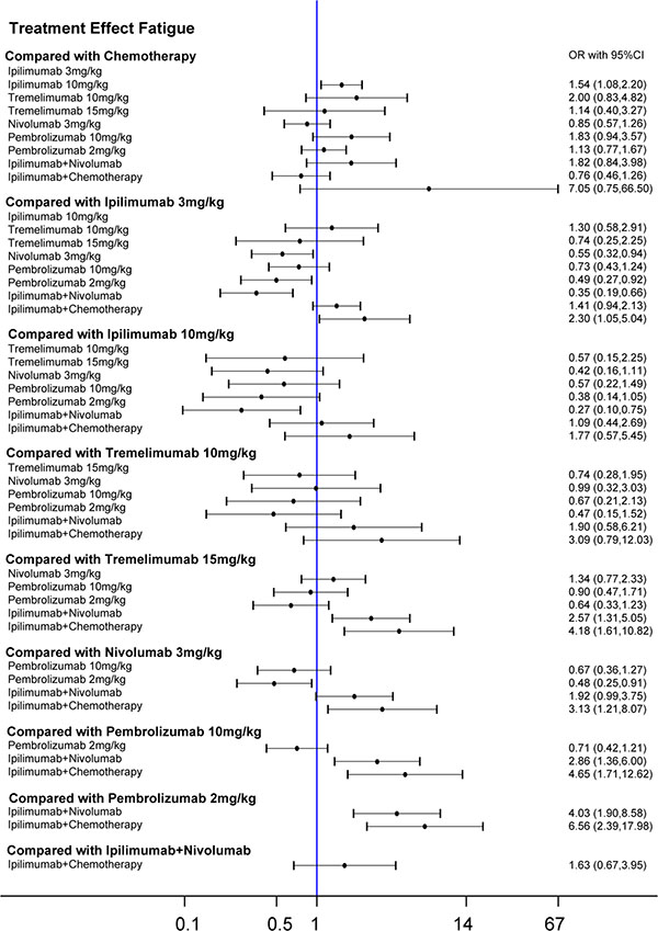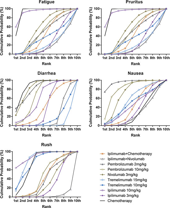 Patients under pembrolizumab 2 mg/kg treatment showed the lowest probability of suffering adverse effects, especially fatigue, diarrhea and nausea. The combination of Ipilimumab and nivolumab was found to be most dangerous as it had a high rank in all five of the adverse effects, they amplified the effects of pruritus, diarrhea and nausea compared to single use of nivolumab. Application of Ipilimumab 10 mg/kg was closely related to trigger fatigue, and chemotherapy was closely related to trigger nausea. Therefore, combined application of ipilimumab and chemotherapy caused a high possibility of both fatigue and nausea.