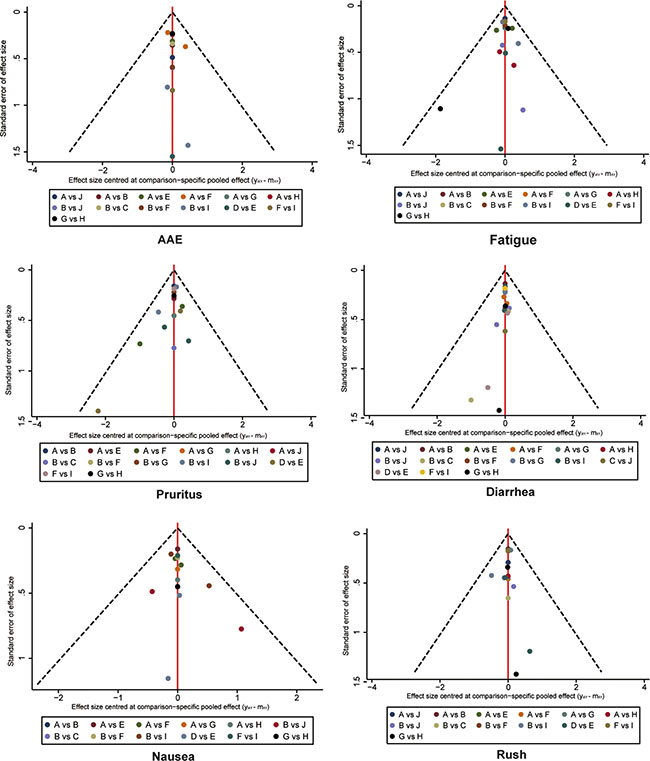 Figure 10: Funnel plot for assessing publications bias of adverse events. A Chemotherapy; B Ipilimumab 3 mg/kg; C Ipilimumab 10 mg/kg; D Tremelimumab 10 mg/kg; E Tremelimumab 15 mg/kg; F Nivolumab 3 mg/kg; G Pembrolizumab 10 mg/kg; H Pembrolizumab 2 mg/kg; I Ipilimumab+Nivolumab; J Ipilimumab+Chemotherapy.