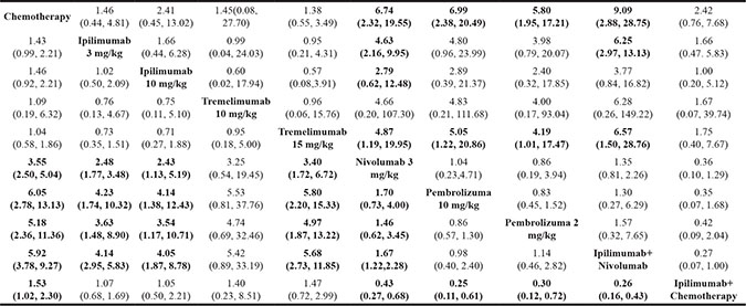 In conclusion, our network meta-analysis results indicate that the combined use of immunotherapy and pembrolizumab is the treatment of choice. This is due to its high efficacy rate and minimal adverse effects. The combined application of ipilimumab and nivolumab may generate a higher incidence rate of adverse effects. Since the combined application of ipilimumab and nivolumab had the highest response rate, it should be applied to patients that do not respond to other treatments. Chemotherapy had a low response rate, high adverse effects and progressive diseases qualities and therefore, it is not a preferred treatment for patients with melanoma.