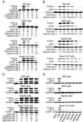 Figure 3: Effects of kinase inhibitors on actinomycin D (ActD)-induced p53 expression. (A) Cells were pretreated with PI3K inhibitors (LY294002 (10 μM) or wortmannin (10 μM)), and an AKT inhibitor (deguelin) for 1 h, followed by treatment with ActD for 24 h in 293 and 293T cells, and for 6 h in HepG2 and Hepa-1c1c7 cells. (B) Cells were pretreated with deguelin, (0.01, 0.02, 0.05, 0.1, and 0.2 μM) for 1 h, followed by treatment with ActD for 24 h in 293 and 293T cells, and for 6 h in HepG2 and Hepa-1c1c7 cells. (C) The MEK1/2 inhibitor (PD98059, 10 μM), JNK inhibitor (SP600125, 50 μM), and p38 inhibitor (SB203580, 25 μM) were applied. Cells were pretreated with kinase inhibitors for 1 h, followed by treatment with ActD for 24 h in 293 and 293T cells, and for 6 h in HepG2 and Hepa-1c1c7 cells. (D) Cells were treated individually with ActD (10 nM), LY294002 (10 μM), wortmannin (10 μM), deguelin (0.2 μM for 293, HepG2, and Hepa-1c1c7 cells, and 0.1 μM for 293T cells), PD98059 (10 μM), SP600125 (50 μM), and SB203580 (25 μM) for 24 h in 293 and 293T cells, and for 6 h in HepG2 and Hepa-1c1c7 cells. The cells were then harvested and cell lysates were analyzed by Western blotting using antibodies against p53, phospho-p53 (Ser15), GAPDH, and β-actin.