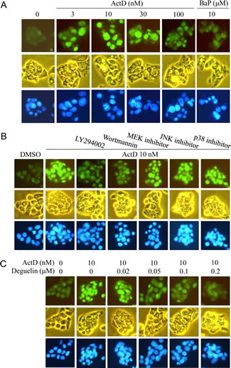 Figure 4: Actinomycin D (ActD)-induced p53 expression as revealed by immunofluorescence imaging. HepG2 cells were seeded on microscope cover glasses in 6-well plates overnight before drug treatment. (A) Cells were treated with ActD (3, 10, 30, and 100 nM) and benzo[a]pyrene (BaP) (10 μM) for 6 h. (B) The PI3K inhibitors, (LY294002 (10 μM) and wortmannin (10 μM)), MEK1/2 inhibitor (PD98059, 10 μM), JNK inhibitor (SP600125, 50 μM), and p38 MAPK inhibitor (SB203580, 25 μM) were applied. Cells were pretreated with kinase inhibitors for 1 h, followed by treatment with ActD for 6 h in HepG2 cells. (C) Cells were pretreated with AKT inhibitor (deguelin, 0.02, 0.05, 0.1, and 0.2 μM) for 1 h, followed by treatment with ActD (10 nM) for 6 h. The cells were then fixed with ethanol. The expression of the p53 protein was probed using an antibody against p53, as revealed by fluorescence of goat polyclonal secondary antibody to mouse IgG-H&L (DyLight® 488). The fluorescence emitted by the cells was viewed using a fluorescence microscope, equipped with U-MWB2 optical filters at excitation/emission wavelengths of 460~490/520 nm. Nuclei were stained with Hoechst 33342 (5 μg/ml) and observed by a fluorescence microscope equipped with U-MWU optical filters with a U-MWU optical filter at an excitation wavelength of 355 nm and an emission wavelength of 420 nm. The morphologies of the cells were examined by phase-contrast microscopy.