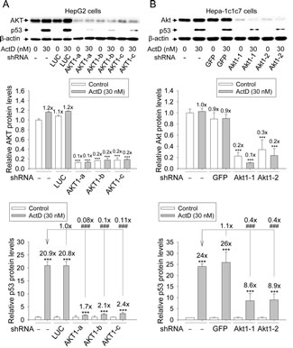 Figure 6: Effects of AKT RNAi on actinomycin D (ActD)-induced p53 expression. (A) HepG2 cells, with and without shRNA-LUC and shRNA-AKT1 were treated with ActD (30 nM) for 6 h. (B) Hepa-1c1c7 cells with and without shRNA-GFP and shRNA-Akt1 were treated with ActD (30 nM) for 6 h. The AKT and p53 protein levels revealed by Western blotting were quantified and standardized against the amount of β-actin protein. The results are expressed as the mean ± SD (n=3). ***p<0.001 and ###p<0.001. * A comparison with DMSO-treated cells without shRNA. # A comparison with ActD-treated cells without shRNA.