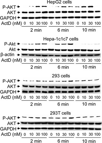 Figure 7: Phosphorylation of AKT induced by actinomycin D (ActD). (A) 293, 293T, HepG2, and Hepa-1c1c7 cells were treated with ActD (0, 10, 30 and 100 nM) for 2, 6, and 10 minutes (min). The cells were then harvested, and cell lysates were analyzed by Western blotting using antibodies against Akt and anti-phospho-Akt (Ser473), GAPDH, and β-actin.