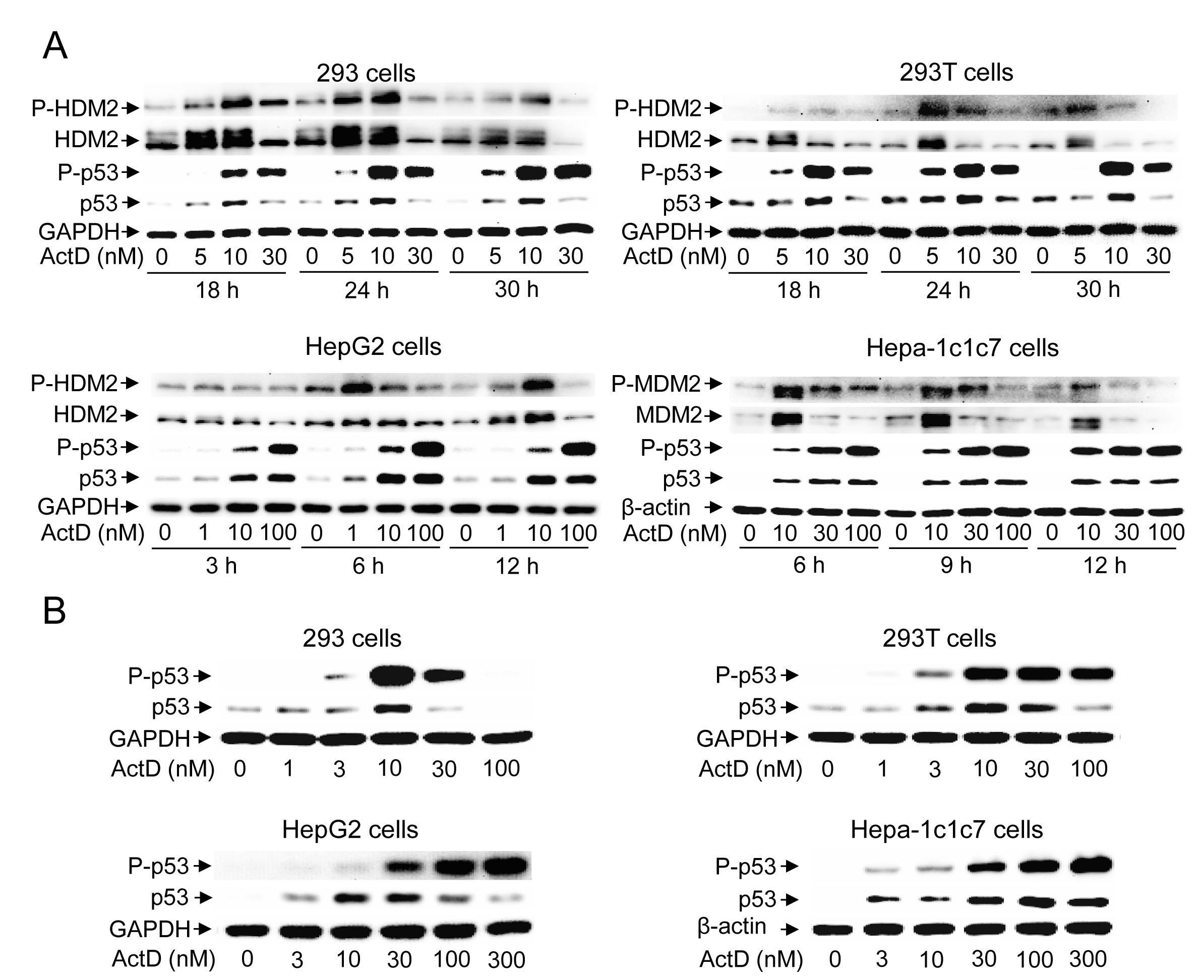 Figure 1: Time course and dose effect of the induction of p53 expression by actinomycin D (ActD). (A) 293 and 293T cells were treated with ActD (0, 5, 10 and 30 nM) for 18, 24, and 30 h. HepG2 cells were treated with ActD (0, 1, 10 and 100 nM) for 3, 6, and 12 h. Hepa-1c1c7 cells were treated with ActD (0, 10, 30 and 100 nM) for 6, 9, and 12 h. (B) 293 and 293T cells were treated with ActD (0, 1, 3, 10, 30 and 100 nM) for 24 h. HepG2 and Hepa-1c1c7 cells were treated with ActD (0, 3, 10, 30, 100 and 300 nM) for 6 h. The cells were then harvested, and cell lysates were analyzed by Western blotting using antibodies against p53, phospho-p53 (Ser15), HDM2, phosphor-HDM2 (Ser166), GAPDH, and β-actin.