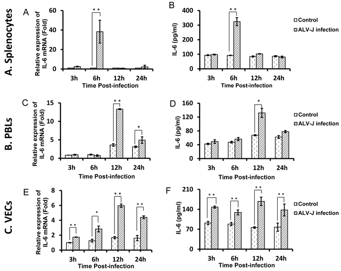 ALV-J promotes IL-6 production in splenocytes, lymphocytes, and VECs
