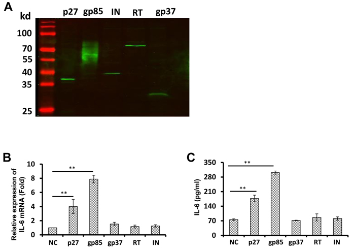 To examine whether the ALV-J-induced IL-6 expression was caused by ALV-J proteins, we analyzed the effect of p27, gp85, integrase, reverse transcriptase, and gp37 on IL-6 levels in splenocytes. Expression vectors of p27, gp85, integrase, reverse transcriptase, and gp37 were constructed, and the protein expression was confirmed by western blotting (Figure 2A). Splenocytes were then transfected with each respective vector. Cells and supernatants were harvested 48 h post-transfection for IL-6 mRNA and protein measurement by real-time reverse transcription-PCR (RT-PCR) and ELISA, respectively. The results showed that only gp85 and p27 increased the production of IL-6, with gp85 playing a more significant role. As shown in Figures 2B and 2C, ALV-J gp85 and p27 proteins increased IL-6 mRNA levels by approximately 8-fold and 4-fold, respectively, (p < 0.01). At protein levels, the increase was smaller, but still significant (p < 0.01). None of the other tested ALV-J proteins were able to increase IL-6 gene expression. These results indicate that ALV-J gp85 and p27 proteins promote the IL-6 expression.