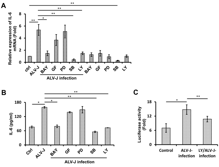 Figure 3: Effect of signal transduction inhibitors on IL-6 expression induced by ALV-J infection. A., B. Splenocytes were pretreated with inhibitors of NF-κB (BAY11-7082 [BAY]), PKC (GF-109203 [GF]), MEK (PD98059 [PD]), MAPK (SB202190 [SB]), PI3K (LY294002 [LY]), or DMSO control for 1 h and then inoculated with or without ALV-J (MOI = 0.1). After 6 h, total RNA was extracted for detecting IL6 mRNA by real-time RT-PCR (A) and the cell culture supernatants were harvested to test IL-6 protein by ELISA B. C. Splenocytes were pretreated with LY or DMSO control for 1 h and then the pretreated splenocytes were transfected with plasmids to test NF-κB activity and infected with ALV-J (MOI = 0.1) or DMEM. After another 6 h, cells were harvested for luciferase analysis.