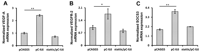 Figure 4: IL-6 promotes VEGF-A and VEGFR-2 expression via STAT3 signaling pathway in VECs in vitro. VECs were pretreated with an inhibitor of STAT3 (stattic) or DMSO control for 1 h. Then, the pretreated VECs were transfected with the pCAGGS vector or IL-6 expression vector for 48 h. Total RNAs were extracted and VEGF-A A., VEGFR-2 B., or SOCS3 C. mRNA expression was detected by real-time RT-PCR.