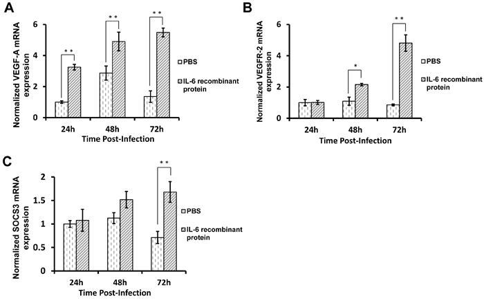Embryos inoculated with recombinant IL-6 protein (1 μg/embryo) or PBS at equal volumes were used to test the effect of IL-6 on VEGF-A and VEGFR-2 expression in vivo. At 1, 2, and 3 days after inoculation, three embryos were tested each from the control and infected groups. RNAs were isolated from the vascular tissues of the embryos and used to test mRNA expression by real-time RT-PCR as described above.