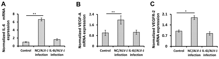 To determine whether ALV-J induced VEGF-A and VEGFR-2 expression via IL-6, VECs were transfected with IL-6 siRNA or negative control siRNA and 24 h later were infected with ALV-J over another 24 h. The expression of IL-6 was then tested as described above to confirm siRNA efficacy.