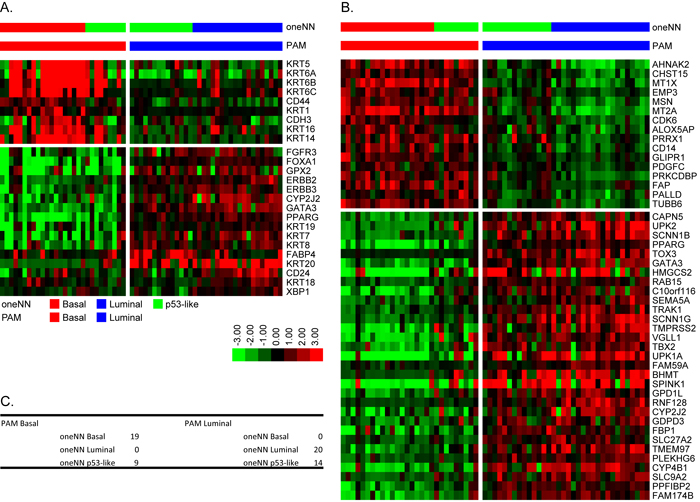 Figure 2: PAM identifies basal and luminal tumors in the 62 FF validation cohort. A. The heatmap depicts relative expression of MDA basal (top) and luminal (bottom) markers as a function of PAM subtype assignment. B. The heatmap depicts relative expression of BASE47 basal (top) and luminal (bottom) markers as a function of PAM subtype assignment. C. Comparison of mRNA PAM subtype assignments and MDA oneNN assignments.