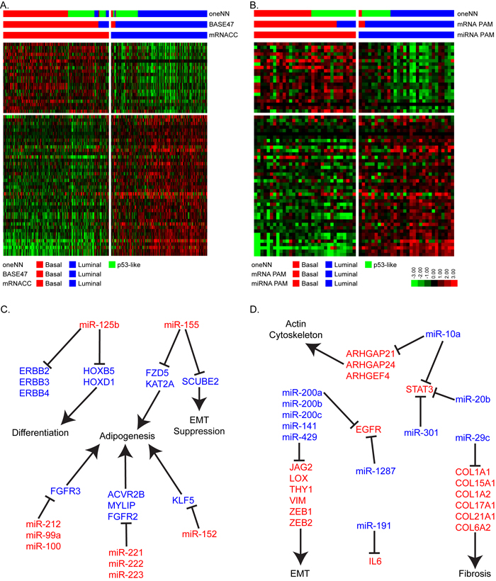 Figure 3: Micro-RNA PAM identifies basal and luminal tumors. A. The heatmap depicts relative expression of 63 miRNAs identified by PAM to accurately assign basal and luminal tumors in TCGA’s cohort (n = 405). B. The heatmap depicts relative expression of the 63-miRNA predictor in the FF cohort (n = 62). C. Schematic representation of basal miRNAs and their luminal associated mRNA target genes and pathways. D. Schematic representation of luminal miRNAs and their basal associated mRNA target genes and pathways.