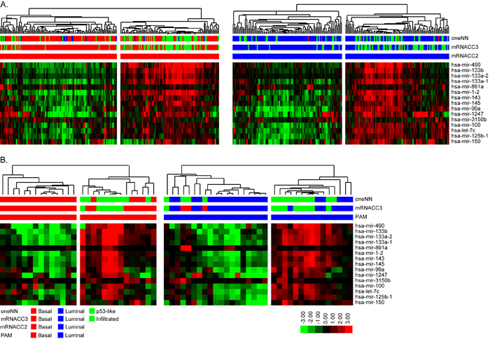 Figure 4: Differential expression analysis identified 15 miRNAs that define infiltrated/p53-like subsets of the basal and luminal subtypes. A. Hierarchical clustering was performed with the 15-miRNA signature in TCGA’s cohort. (Left) Basal tumors identified by mRNA CC were isolated and clustered. The heatmap depicts relative expression of the 15-miRNA signature. (Right) Luminal tumors identified by mRNA CC were isolated and clustered. The heatmap depicts relative expression of the 15-miRNA signature. B. Hierarchical clustering with the 15-miRNA signature in the FF cohort. (Left) Basal tumors identified by mRNA PAM prediction were isolated and clustered. The heatmap depicts relative expression of the 15-miRNA signature. (Right) Luminal tumors identified by mRNA PAM prediction were isolated and clustered. The heatmap depicts relative expression of the 15-miRNA signature.
