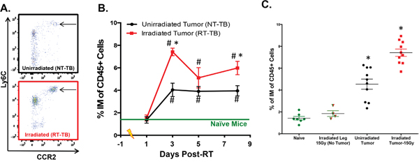 Figure 1: Radiotherapy increases peripheral blood IM. 1x105 Colon38 tumor cells were injected i.m. in C57BL/6 mice and left untreated or treated with 15 Gy radiation on day 7 of tumor growth (equivalent to day 0 on Figure 1 x-axis). A. Representative flow cytometry plots illustrating peripheral blood CCR2+ IM (arrow) from unirradiated and day 3-post RT treated mice. Plots are gated on CD45+, CD11b+ cells, and IM were shown to be Ly6G negative. B. The percentage of IM of CD45+ cells in the peripheral blood at various timepoints post-RT was determined by flow cytometry. In C. peripheral blood IM from naïve non-tumor-bearing mice + local RT (15 Gy) to leg, tumor-bearing, and tumor bearing + local RT (15 Gy) were plotted from the day 3 post-RT (day 10 of tumor growth) timepoint. # (p < 0.05) represents significance relative to naïve group and * represents significance to unirradiated tumor group as determined by ANOVA followed by a Tukey post-hoc test. n=4-10 for all groups at each time point.