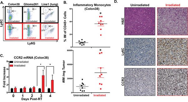 We next determined if CCR2+ IM were present intratumorally and whether RT modulated the number of these cells. We performed an experiment examining the percentage of intratumoral IM in unirradiated to irradiated tumors at day 4 post-RT, which is one day after the observed spike of circulating IM. Colon38 tumors were harvested from mice, processed into single cell suspensions, and stained with fluorescent antibodies to assess the total immune infiltrate of each tumor by flow cytometry. Representative flow cytometry dot plots from unirradiated (black; top) and irradiated (red; bottom) tumors demonstrate a dramatic increase of IM in RT-treated tumors (Figure 2A). Proportionally to all immune cells, IM were significantly increased by approximately 4-fold in RT-treated tumors at this time point and similar data were obtained when the number of IM was normalized for tumor size (Figure 2B). As expected, the majority of intratumoral IM (CD45+, CD11b+, Ly6C(high), Ly6G-) were positive for CCR2 expression and represented the vast majority of all CCR2+ intratumoral cells (data not shown). Using a similar radiation/tumor model as Colon38, we observed increases in intratumoral IM following RT in a model of glioblastoma, (Glioma261-syngeneic with C57BL/6 mice) as well as in a model of lung carcinoma (Line1-syngeneic with BALB/c mice) suggesting that this phenomenon is generalizable across cancer types and strains of mice (Figure 2A). Focusing on the Colon38 model, we demonstrated that CCR2 mRNA expression was unchanged between RT-treated and untreated tumors at early time points, however they were significantly elevated in RT-treated tumors relative to non-RT-treated tumors three and four days post-RT (Figure 2C). These data suggest that the influx of intratumoral CCR2+ IM does not occur immediately following RT, but is delayed and occurs after the increase of circulating IM (Figure 1). Immunohistochemical analysis of the tumors (day 4 post-RT) revealed striking changes to irradiated tumors when compared to unirradiated tumors. For example, RT decreased the density of tumor cells while increasing the infiltration of immune cells as assessed by hematoxylin and eosin staining (Figure 2D-top images) and CD45+ staining (data not shown) respectively. Importantly, the level of Ly6C+ (Figure 2D-middle images) and CCR2+ (Figure 2D-bottom images) cells (surface markers predominately found on IM), were greatly increased and uniformly distributed in irradiated tumors. These complementary data demonstrate that RT results in an altered intratumoral immune infiltrate characterized by a striking increase of CCR2+ IM three-four days post-RT.