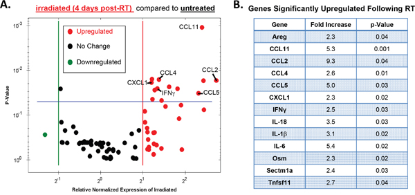 Figure 3: Radiotherapy modulates various intratumoral cytokines and chemokines. Tumors were injected and irradiated as outlined in Figure 1, and mRNA from day 4 post-RT (day 11 of tumor growth) tumor homogenate was used to examine the expression of various cytokine and chemokines using an BioRad RTPCR plate array. A. A volcano plot illustrating changes in gene expression between irradiated and unirradiated tumors where red defines upregulated genes (2-fold induction), black defines no change, and green defines downregulated genes. Genes that exhibited a significant increase in expression in irradiated tumors (p<0.05) fall above the blue line and are listed in B. Significance determined by t-test. n=3 for each group.