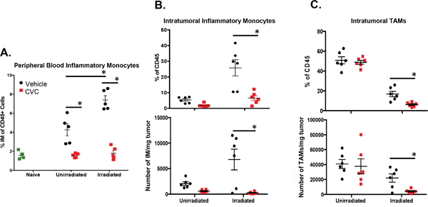 Having identified that RT facilitates the infiltration of IM, a potentially tumor-promoting cell type, into the tumor microenvironment, we next determined whether blocking this infiltration could improve the efficacy of RT. We used our previously described mouse model and treated mice with 15 mg/kg of a small molecule dual inhibitor against CCR2/CCR5 (CVC) daily starting 2 days before RT. CVC was effective in reducing the numbers of circulating IM in both unirradiated and irradiated tumor-bearing mice to the levels of non-tumor-bearing control mice (Figure 5A). CVC also resulted in a significant decrease in the proportion and number of both IM (Figure 5B) and typically immunosuppressive TAMs (predominantly derived from differentiated IM) (Figure 5C) in irradiated tumors compared to vehicle controls. These results suggest that CVC is hitting the intended target (IM) both in the peripheral circulation as well as in the tumor.