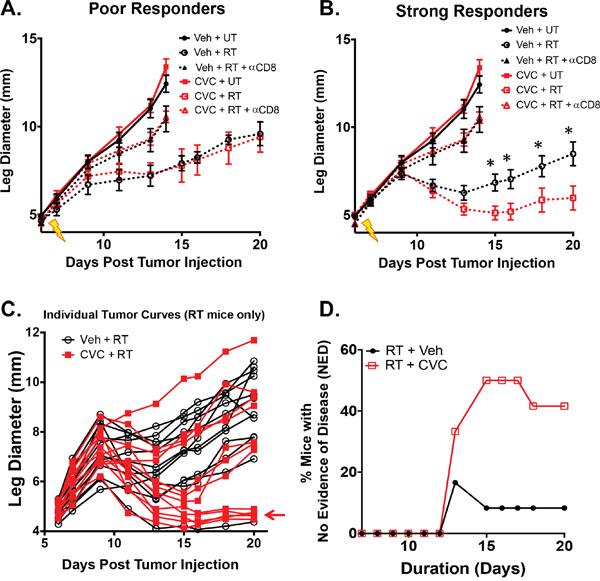 Figure 6: Dual blockade of CCR2/CCR5 (CVC) improves RT efficacy in radioresponsive tumors. Tumors were injected and irradiated as described in Figure 1. Starting two days prior to irradiation, mice were treated daily with 15 mg/kg CVC (CCR2/CCR5 antagonist) or vehicle control s.c. for 15 days. Tumor growth was monitored in unirradiated along with poorly radioresponsive A. and strongly radioresponsive B. tumors. The same experiment was performed in conjunction with CD8+ T cell depletion (200 ug anti-CD8 given every 3 days starting on day 4). Untreated and anti-CD8 data from (A) is duplicated in (B) for reference. Individual growth curves (poor and strong responders combined) from both irradiated vehicle (black) and CVC (red) treated mice are presented in C, D. Percent mice with no evidence of disease (NED) was calculated when tumor size was reduced to non-tumor leg measurements between the irradiated +/- drug groups. * (p < 0.05) represents significance as determined by ANOVA followed by a Tukey post-hoc test. n=8 for both unirradiated groups; 3-4 for poor responders; 8-9 for strong responders. n=6 for anti-CD8 studies. n=12 for NED plot.