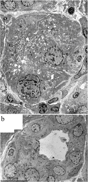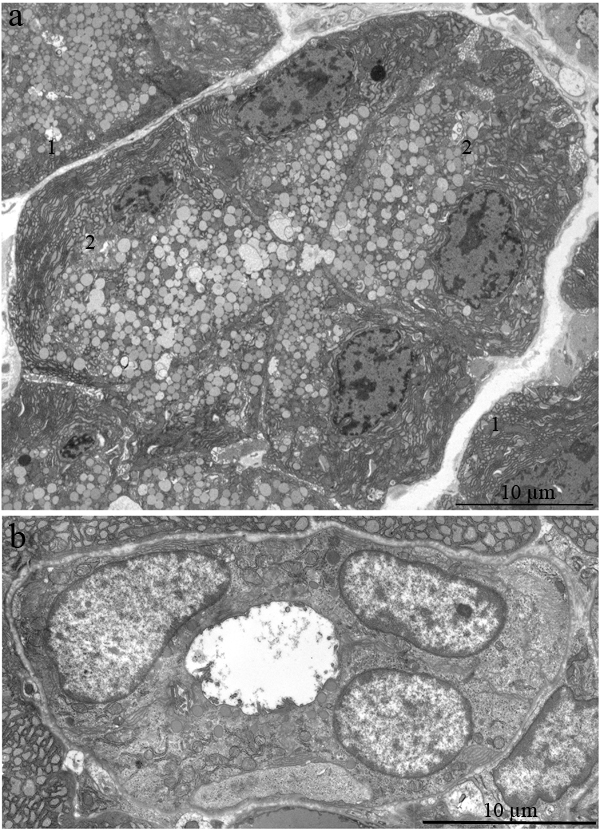 We observed various stages of ultrastructural deterioration of the ducts: from ducts with partially altered ultrastructure (Figure 5b) to those with completely altered epithelial cells (Figures 4a and 5a). According to our quantitation, the number of intact intercalary ducts in lacrimal-gland tissue of Wistar rats at this age decreased 12-fold in comparison with the 3-month-old rats. In most ducts of 24-month-old Wistar rats, the lining epithelial cells had electron-dense cytoplasm with difficult-to-distinguish cytoplasmic contents and numerous membrane-bounded granules (Figures 4a and 5a). In some cases, we could see that the granule contents were released into the lumen of the ducts (arrows “2” in Figure 4a). As a result, the duct lumen was filled with electron-dense granules, sometimes rather big ones. Apparently, such ultrastructure of the ducts represents the state known as duct blockage [5, 28]. In our opinion, it indicates the absence of functional activity of the lacrimal gland. Acini with native ultrastructure in old rats occurred rarely. According to our data, by age 24 months, in lacrimal-gland tissue of Wistar rats, the relative number of intact acini decreased 27-fold in comparison with 3-month-old rats. At the same time, remnants of degraded acinar cells were often seen among overgrown ducts (Figures 4a and 4b). Naturally, a significant reduction in tear secretion and deterioration of tear quality (similar to that in old people) were observed in 2-year-old rats [17].