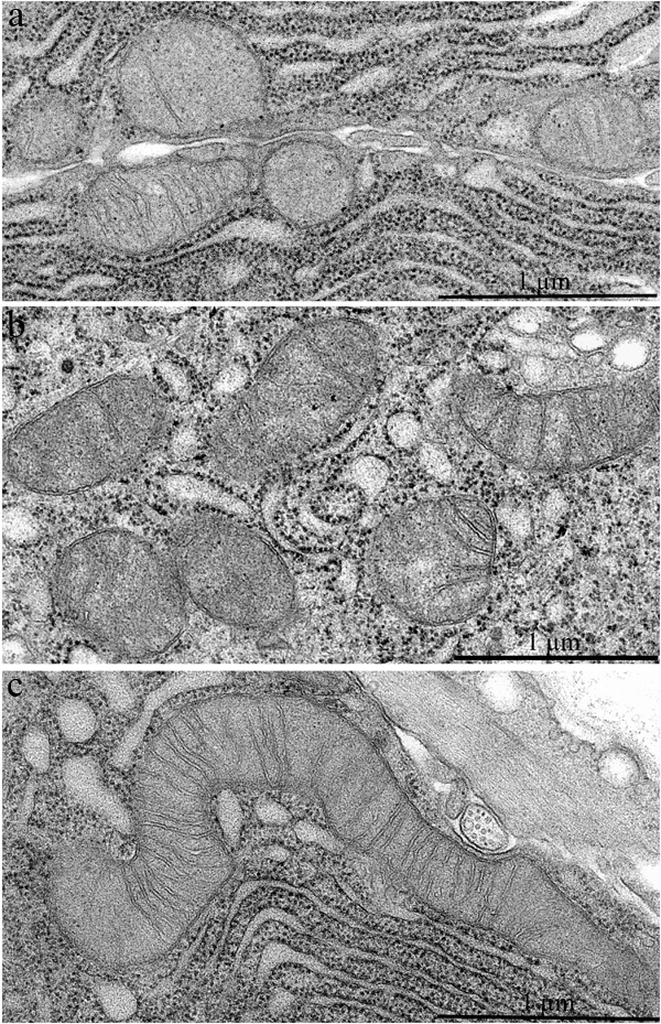 Figure 2: Mitochondrial ultrastructure in acinar cells in the lacrimal gland of Wistar rats. A. 3-Month-old, B. 24-month-old untreated rats, and C. 24-month-old rats that received 250 nM SkQ1.