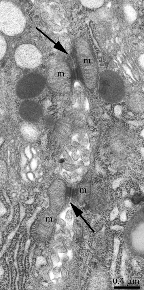 Figure 3: Ultrastructure of an intercellular junction complex formed by desmosomes and mitochondria that were tightly adjacent to tonofilaments on the side of each contacting acinar cell. The arrows show desmosomes; m: a mitochondrion.