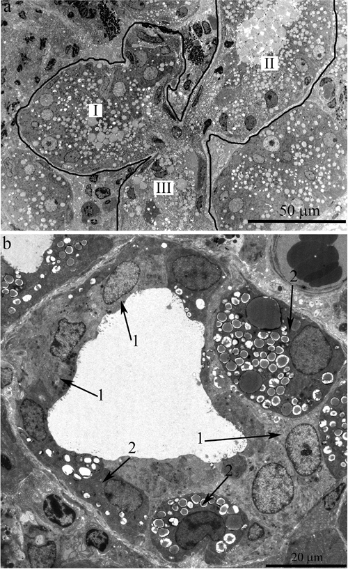 Figure 5: Ultrastructure of the lacrimal gland of Wistar rats at age 24 months. A. The general appearance of a duct with complex branching: there are three branches from the main trunk of the duct in the form of paddles (labeled with Roman numbers) sharing a common center. B. A duct with only partially altered ultrastructure of the lining epithelial cells. Arrows “1”: epithelial cells whose ultrastructure is characteristic of epithelial cells of lacrimal-gland ducts in young Wistar rats. Arrows “2”: electron-dense cells with difficult-to-distinguish cytoplasmic contents and numerous membrane-bounded big granules.
