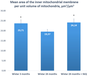 Figure 7: The area of the inner mitochondrial membrane per unit of volume of mitochondria in the lacrimal-gland tissue of Wistar rats at ages 3, 24, and 24 months; the latter group received the antioxidant SkQ1 (starting at age 1.5 months at the dose 250 nmol/ [kg body weight] daily). The data are presented as mean ± SEM; *p < 0.05 compared to 24-month-old untreated Wistar rats.