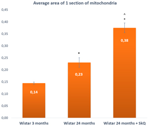 Figure 8: The area of one section of a mitochondrion in the lacrimal-gland tissue of Wistar rats at ages 3, 24, and 24 months; the latter group received the antioxidant SkQ1 (starting at age 1.5 months at the dose 250 nmol/ [kg body weight] daily). The data are presented as mean ± SEM; *p < 0.05 compared to 3-month-old untreated Wistar rats, ^p < 0.05 compared to 24-month-old untreated Wistar rats.