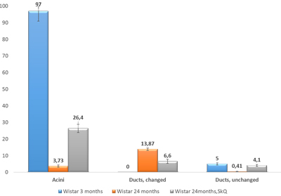 Figure 9: The numbers of sections of acini and of altered and unaltered intercalary ducts per unit of area (0.23 mm2) in the lacrimal-gland tissue of Wistar rats at ages 3, 24, and 24 months; the latter group received the antioxidant SkQ1 (starting at age 1.5 months at the dose 250 nmol/ [kg body weight] daily). The data are presented as mean ± SEM.