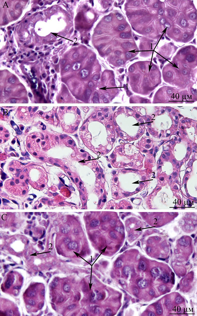 Figure 10: Histological structure of the lacrimal gland. A. A fragment of a lobule from the lacrimal gland of a 3-month-old Wistar rat; B. a fragment of a lobule from the lacrimal gland of a 24-month-old Wistar rat; C. a fragment of a lobule from the lacrimal gland of a 24-month-old Wistar rat that was treated with the antioxidant SkQ1 (starting at age 1.5 months at the dose 250 nmol/ [kg body weight] daily). Arrows “1”: unaltered acini; arrows “2”: intercalary ducts. Staining with hematoxylin and eosin, magnification 400×.
