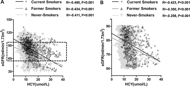 Continuous data were expressed as mean ± standard deviation (SD) or median [interquartile range (IQR)]. Baseline characteristics were compared between smokers and non-smokers using the t test or Mann-Whitney U test. Categorical data were presented as percentages and were compared using the chi-square test or Fisher’s exact test. We analyzed the association between eGFR and relevant covariates with logistic regression models to evaluate independent parameters affecting the eGFR levels. Adjusted correlation between HCY and eGFR was evaluated by partial correlation analysis.