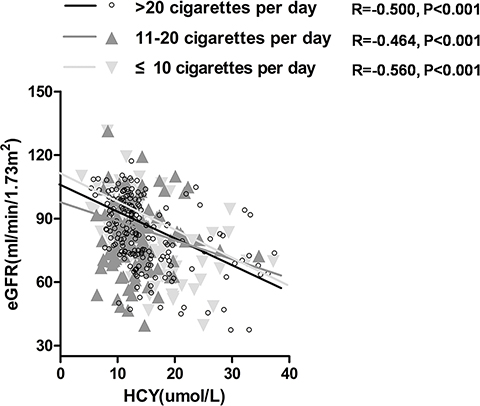 Several prior studies have reported that cigarette smoking, in a dose-dependent manner, was a risk factor for renal function deterioration [24, 25]. However, little information is available about the underlying mechanisms for these associations. Li [26] and Lu et al. [27] successively reported that elevated HCY levels was an important pathogenic factor for glomerular damage. Similar to previous studies, we also found that smoking and HCY worked as independent influencing factors for renal function deterioration in hypertensive patients. Moreover, our study further observed that eGFR were significantly negatively correlated with HCY, and this correlation might be stronger in current smokers. Besides, eGFR was also significantly correlated with HCY in different cigarette consumption respectively, and only smokers consuming over 20 cigarettes per day showed accelerating early renal function deterioration. Thus, HCY may involve in smoking related renal function deterioration. Meanwhile, the effect of HCY and smoking on renal function deterioration was notable in hypertensive patients with early renal function deterioration.