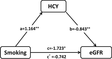 Figure 5: The mediation of homocysteine (HCY) on the association between smoking and deterioration of renal function in hypertensive patients (**P < 0.001, *P < 0.05).