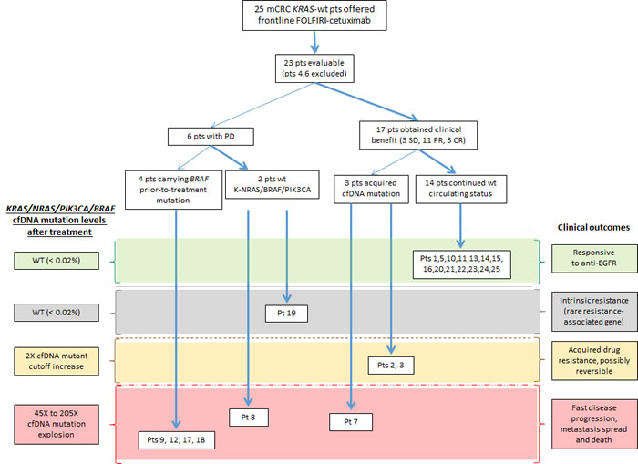 The aim of the present study was to gain additional knowledge regarding the clinical application of LqB by prospectively quantitating the temporal evolution of mutations in genes in the RAS pathway in cfDNA obtained from KRAS wt mCRC patients who were treated with first line FOLFIRI-cetuximab. We sought to relate the circulating genetic status of the patients with tumor genotypes, drug resistance, and predictions of clinical outcomes.