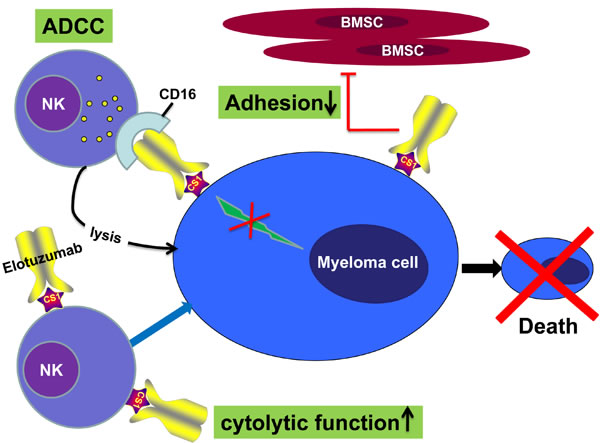 Figure 2: Mechanisms of action of elotuzumab. The primary mechanism of action of elotuzumab against myeloma cells is NK cell-mediated ADCC. Elotuzumab can also interfere with the adhesion of myeloma cells to bone marrow stromal cells (BMSC), or can induce NK cell activation directly through binding CS1 expressed on NK cells.