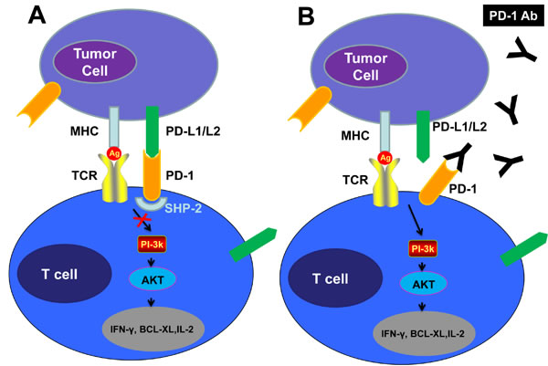Figure 3: Checkpoint Inhibition via the PD-1 Pathway “Put the Brakes on” the Antitumor Response, While PD-1 or PD-1-Blocking Antibodies Release the Brakes. A, PD-L1 expressed on tumor cells binds to PD-1 on T-cells recruiting a phosphatase, SHP-2, which blocks the PI3K pathway and leads to down-regulation of T-cell survival proteins, including IFN-γ, BCL-XL and IL-2, resulting in T-cell anergy or “exhaustion”, thereby “braking” the T-cell immune response. B, The anti-PD-1 antibodies block the PD-1 pathway “release the brake” preventing suppression of the anti-tumor response.